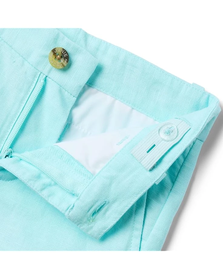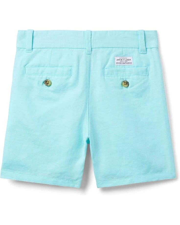 - Exude a fun vibe and hop around in comfort wearing Janie and Jack® Boys Linen Flat Front Shorts in longer length and a regular-fitted silhouette. The shorts feature a mid-rise waistband with belt loops, zip-fly & button closure, two on-seam pockets on the front, and two welt pockets on the back with button detailing.