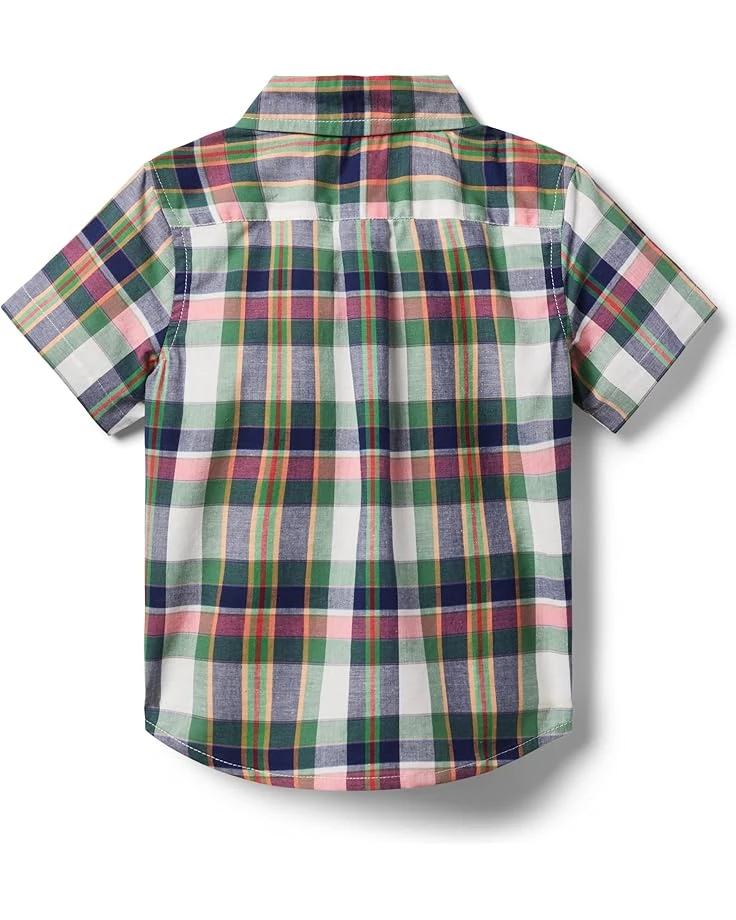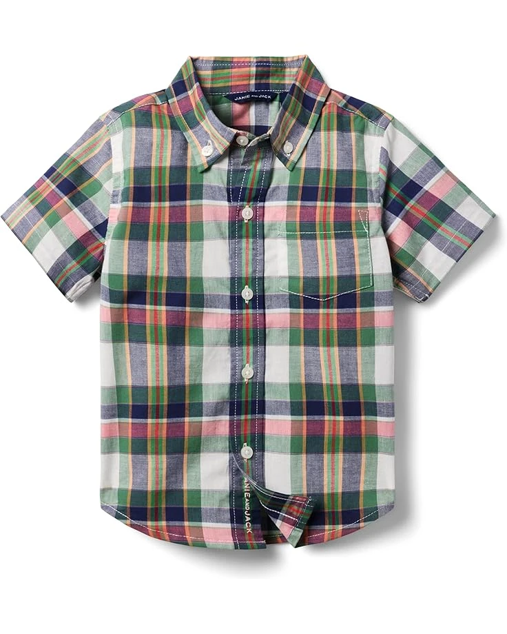 - Crafted in beautiful plain pattern allover and a classic fitted silhouette, the Janie and Jack® Boys Madras Plaid Top is a perfect pick for your little one’s wardrobe. The shirt features a button-down collar, full front-button closure, one patch pocket on the left chest, short sleeves, and a curved hemline.
