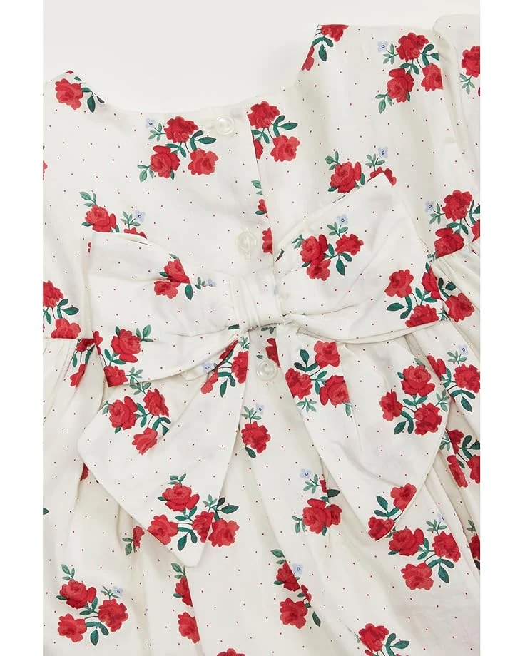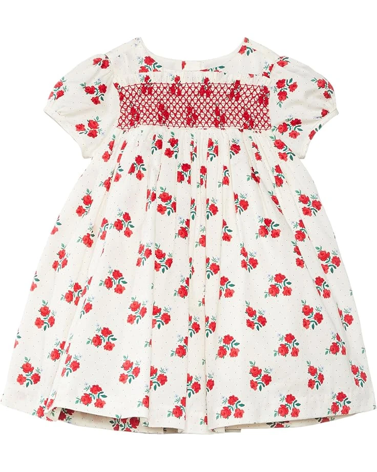 - Let your kiddo enjoy a comfortable yet stylish fit wearing the Janie and Jack® Floral Sateen Smocked Dress. It features a crew neckline, short puffy sleeves, and bow accentuation at the back.