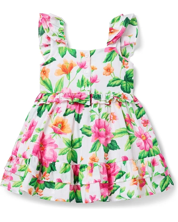 - Enjoy a playful day looking pretty donning the Janie and Jack® Girls Multi Floral Dress, crafted in a strking allover floral printed design. The dress features a squared neckline, ruffled straps, chic ruffled detailing on the front & back, half back-button closure, and a knee-length fit-and-flare silhouette.