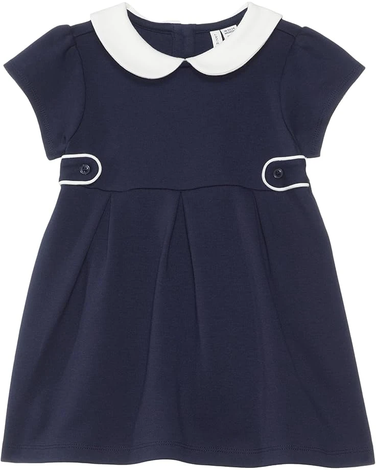 - Crafted for an all day style and comfort, the Janie and Jack® Ponte Dress features ruffled flat collar, center back three-button closure at neckline, short sleeves, center chest front bow design, and a straight hemline.