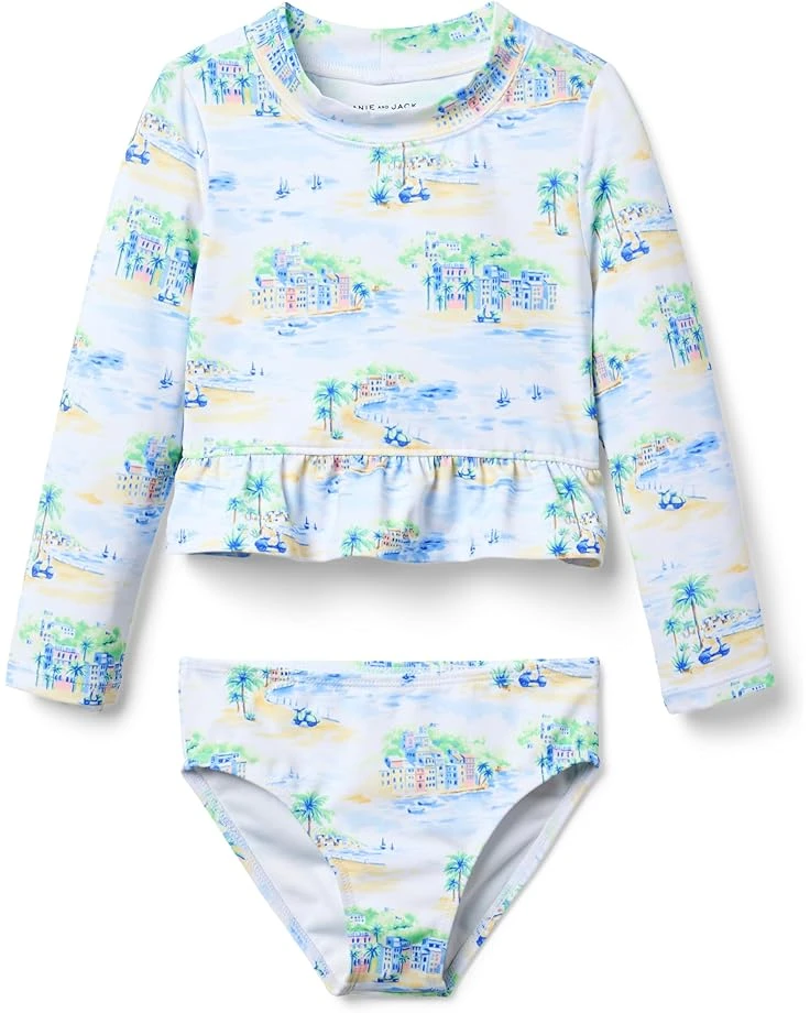 - A perfect choice for your kid’s beach trips, the Janie and Jack® Scenic Rashguard Two-Piece Suit includes a long-sleeve top and pull-on briefs. The top of the set is designed with a crew neckline and a tiered hem. Featuring an allover print, this full-coverage swimsuit suit will keep your kid feeling comfortable and stylish.