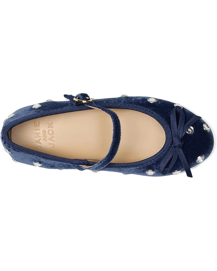 - A charming bow and allover embedded rhinestones give the Janie and Jack® Velvet Jewel Flat a charming look. The footwear features polyester upper, faux leather lining, and paper board insole.